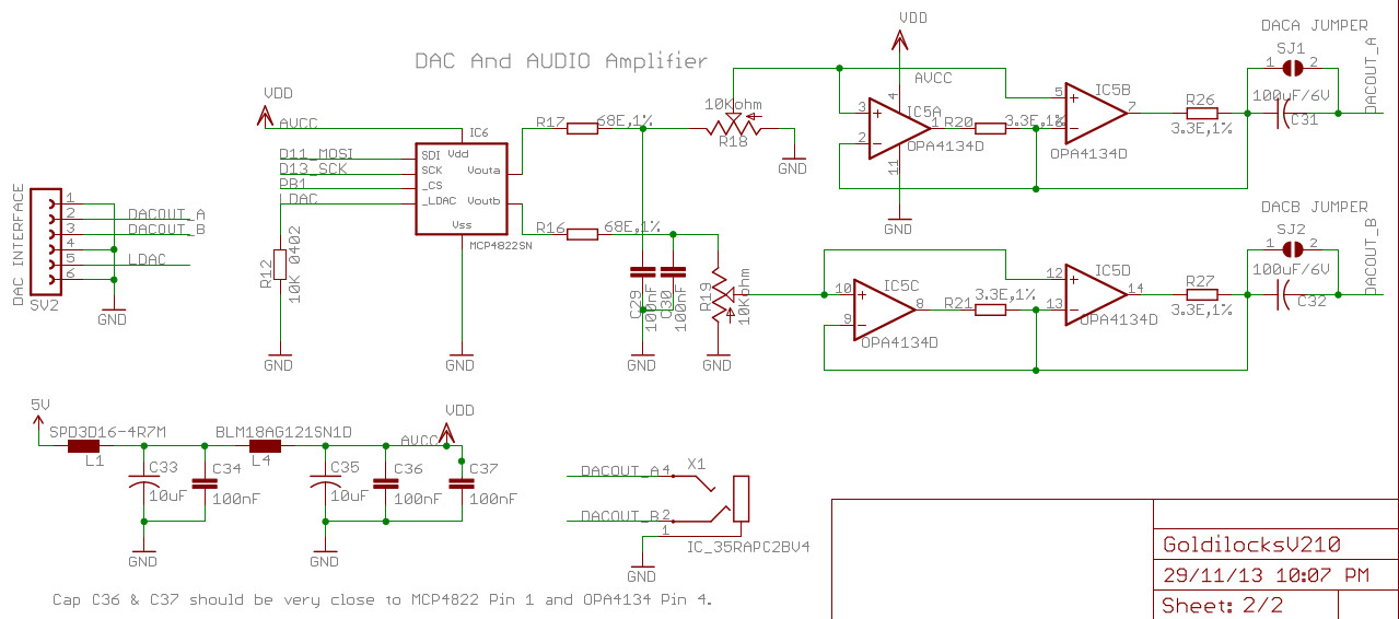 Test results are in. Check out the detailed post on Goldilocks Analogue – Testing. Following the testing, I’ve redesigned the analogue output section to make it much more capable. It now support simultaneous AC and DC outputs, with an application specific headphone amplifier device to provide AC output, and high current OpAmp to provide DC output.