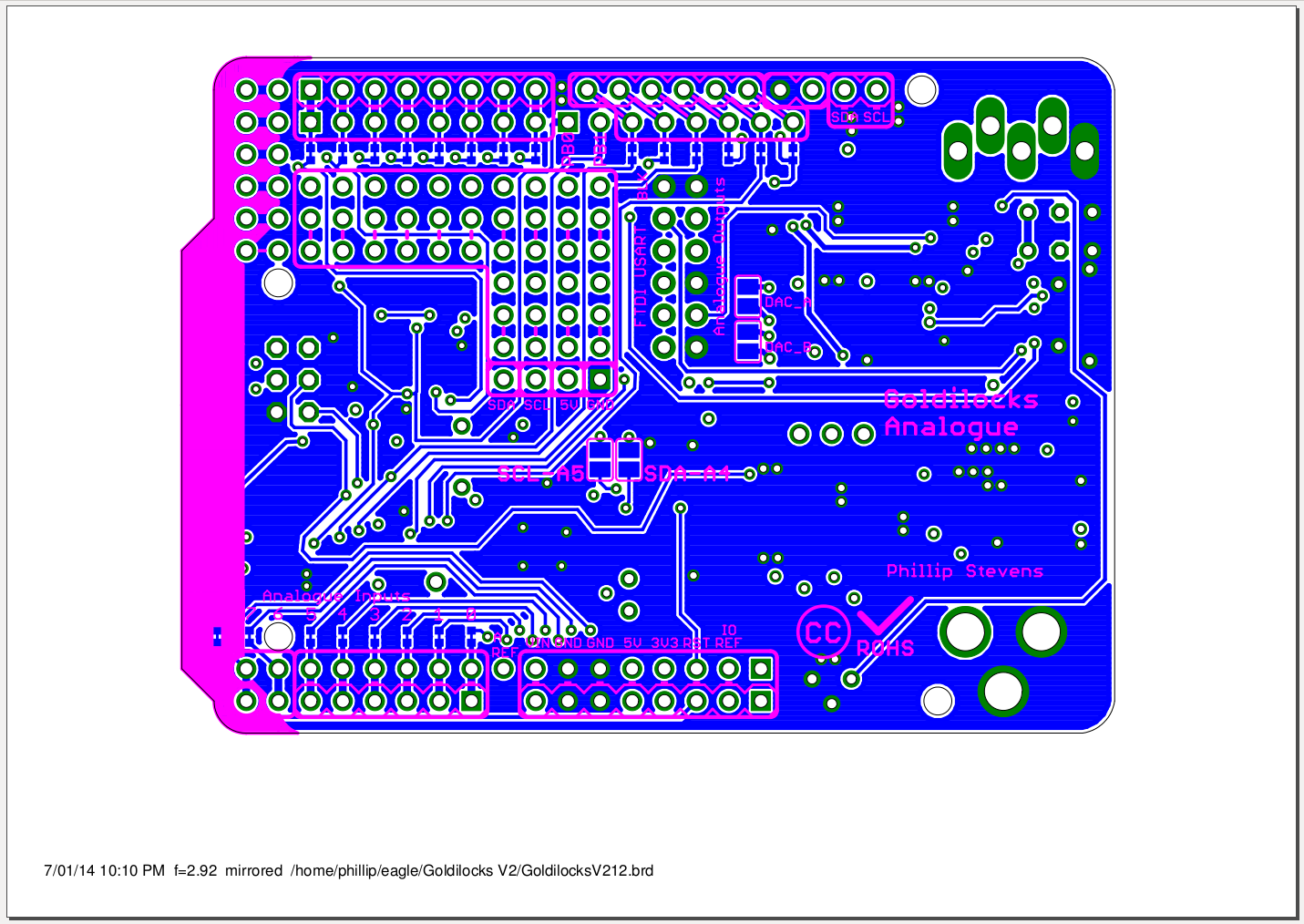 Goldilocks Analogue BottomOn the back of the board, mirrored here, things look as we expect. The previously noted bridge capability for the I2C bus to A4/A5 is there, as is the capability to bridge the DAC A and DAC B output capacitors to enable DC output.
