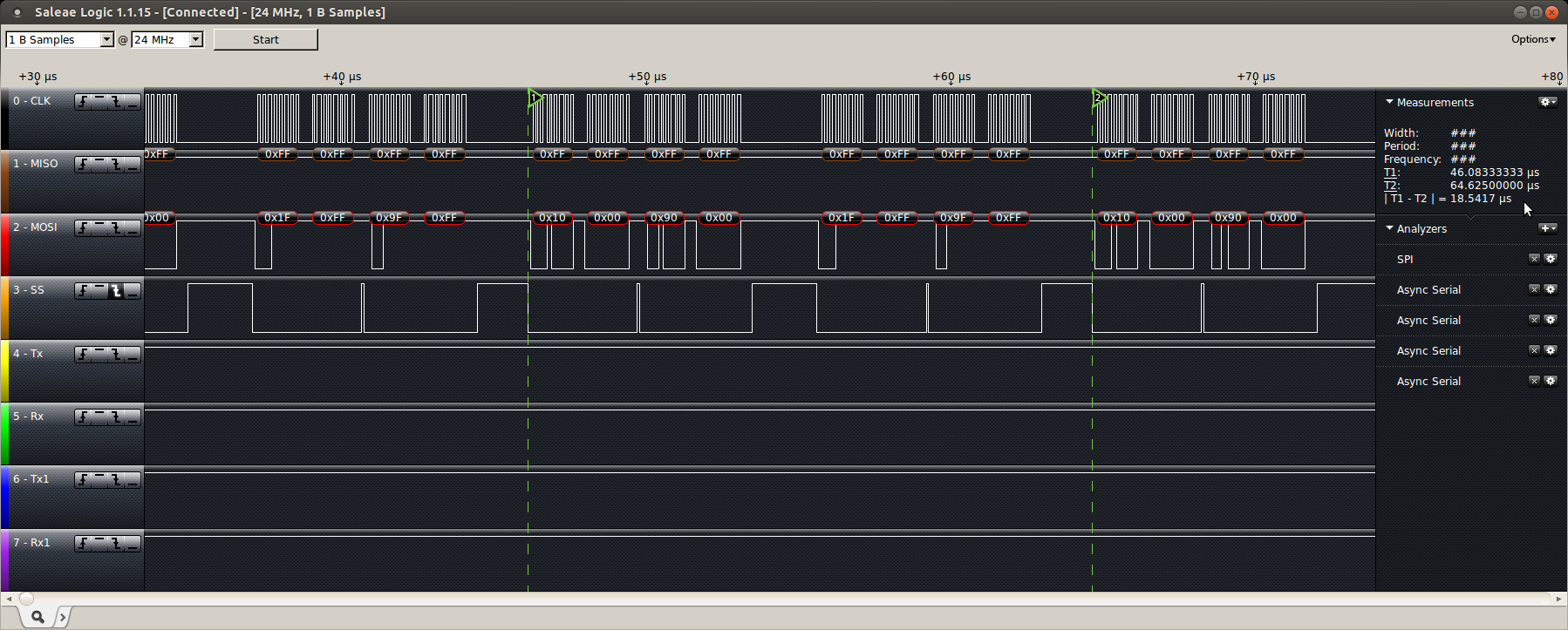 Well I’ve had it on the desk now for two nights, and I’m very impressed that it seems to generally meet the specification that was intended. The code for setting the DAC levels is currently only optimised for setting two values at a time. Specifically, it is not a streaming function. Never-the-less, it is possible to achieve the stated goal for both DAC channels. The actual number achieved is 108 kSamples/second, shown below, or 18.8us to transmit 2 samples on 2 channels.