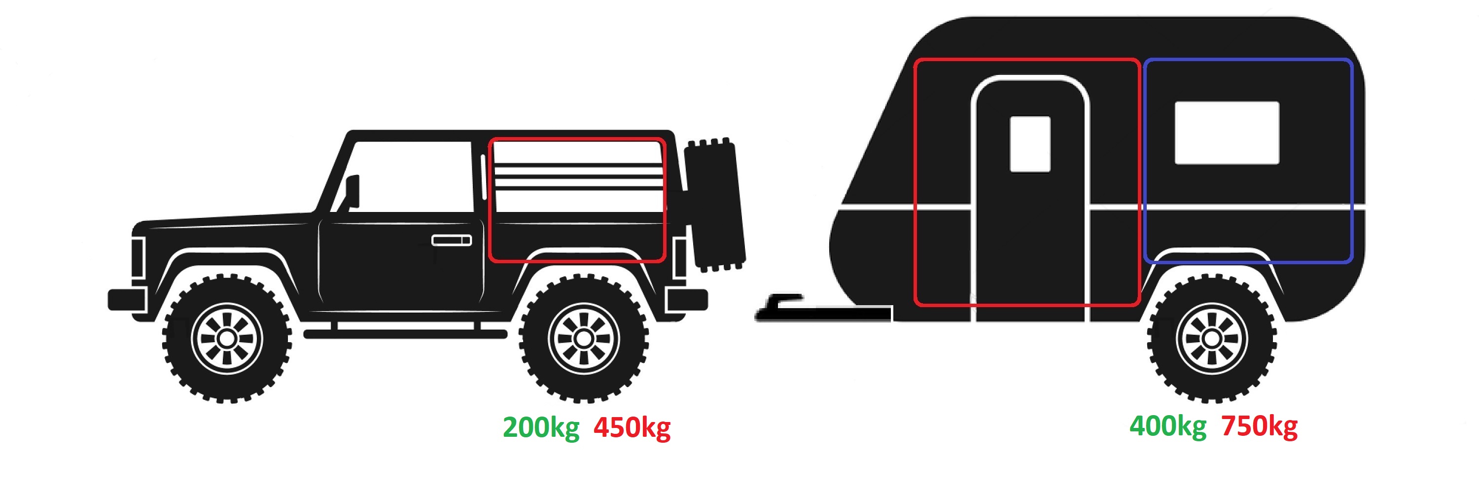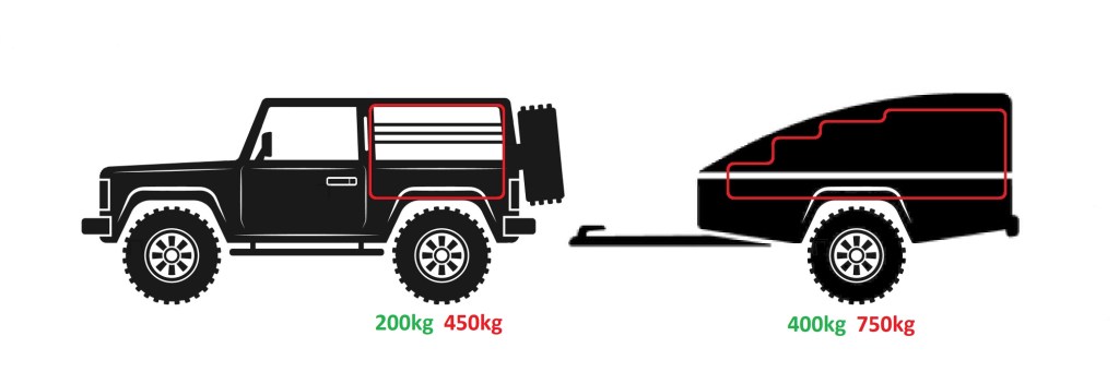 - Teardrop Camper – 200kg in vehicle, 400kg in camper