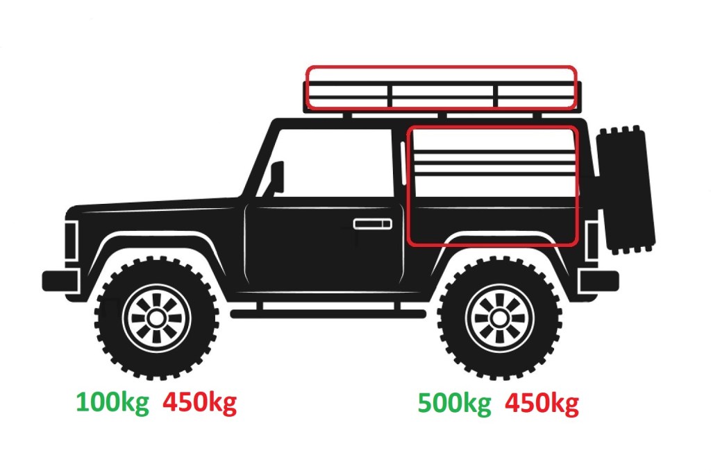 - Roof Top Tent – 500kg in vehicle, 100kg of RTT (and outside)