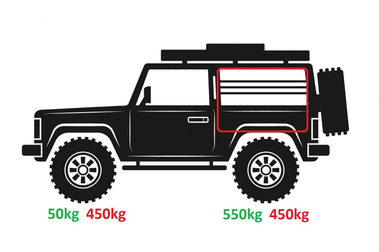 - Roof Rack – 450kg in vehicle, 150kg on roof (and outside)