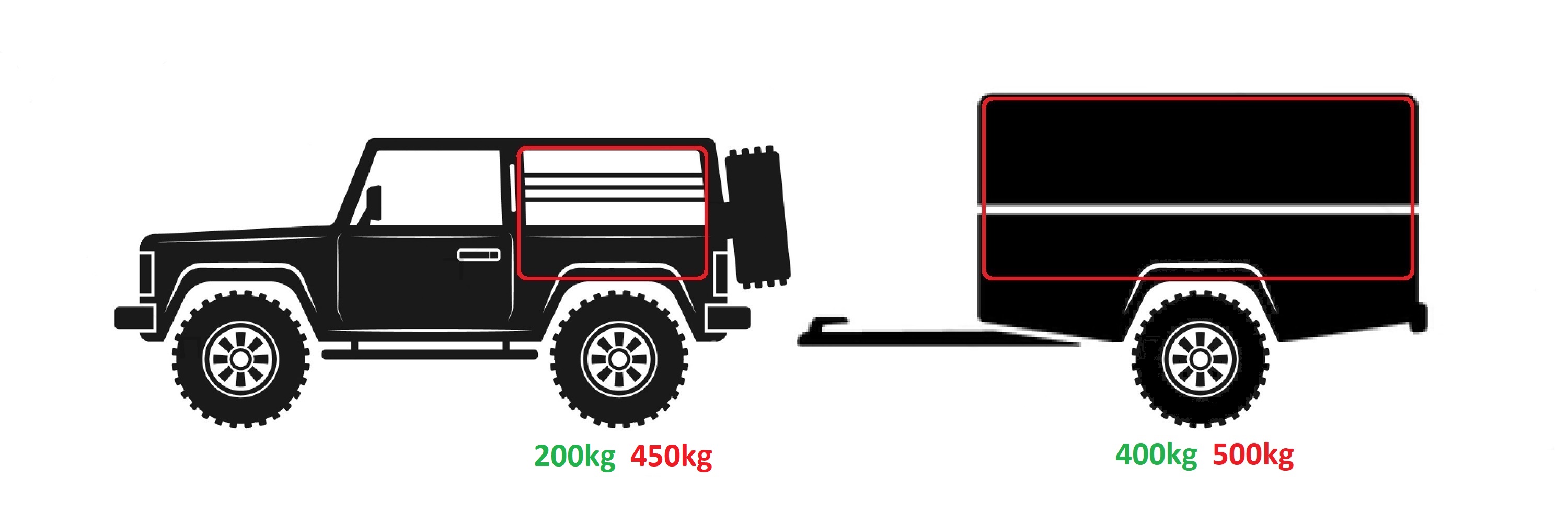 - Box Trailer – 200kg in vehicle, 400kg in trailer