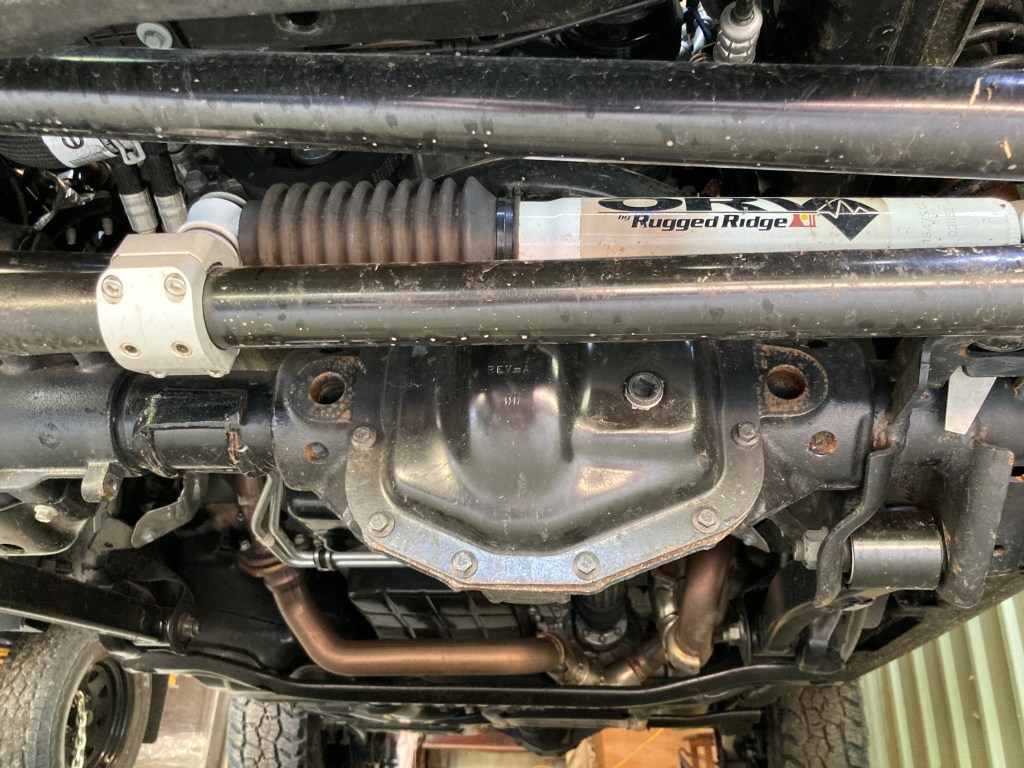 The recommendation is to use a Teraflex steering damper relocation kit to move the damper above the drag link and out of the way of harm. Together with the relocation kit it is necessary to add an aftermarket steering damper. The brand doesn’t matter too much but for the record, I used an ORV Rugged Ridge steering damper originally for a JK Wrangler.