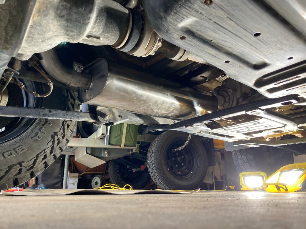 Unfortunately the 2DR version of the Borla system doesn’t fit the Rubicon RHD version precisely, and the muffler needed to be relocated 35mm to the rear to clear some protruding sections of the transfer case housing. This was done by extending the muffler front pipe and shortening the tailpipe flange, each by 35mm.