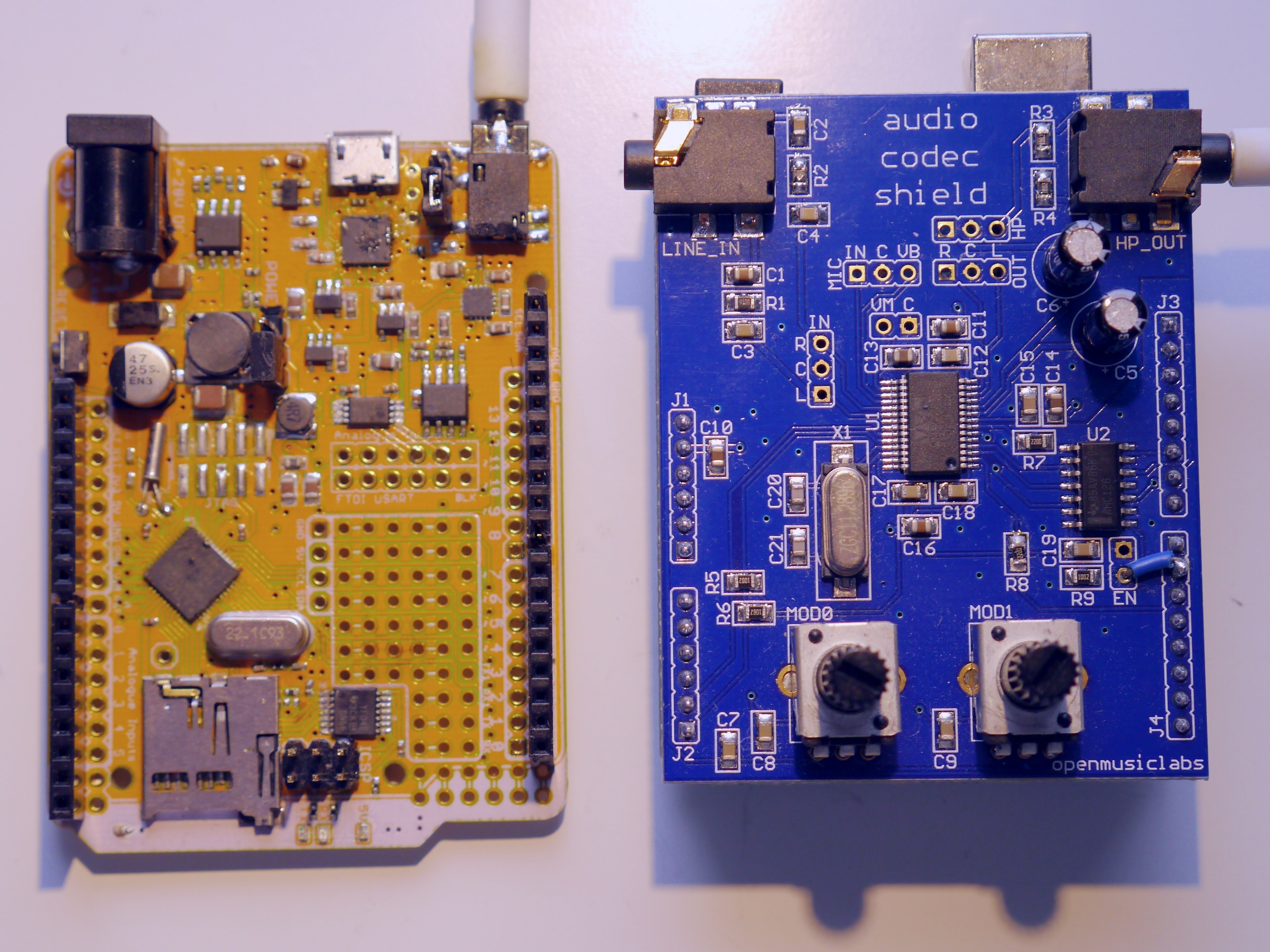 The Audio Codec Shield uses a very capable Wolfson Audio WM8731 device to generate its output. The WM8731 has stereo 24-bit multi-bit sigma delta ADCs and DACs complete with oversampling digital interpolation and decimation filters. Digital audio input word lengths from 16-32 bits and sampling rates from 8kHz to 96kHz are supported. The WM8731 has stereo audio outputs which are buffered for driving headphones from a programmable volume control and line level outputs are also provided complete with anti-thump mute and power up/down circuitry.