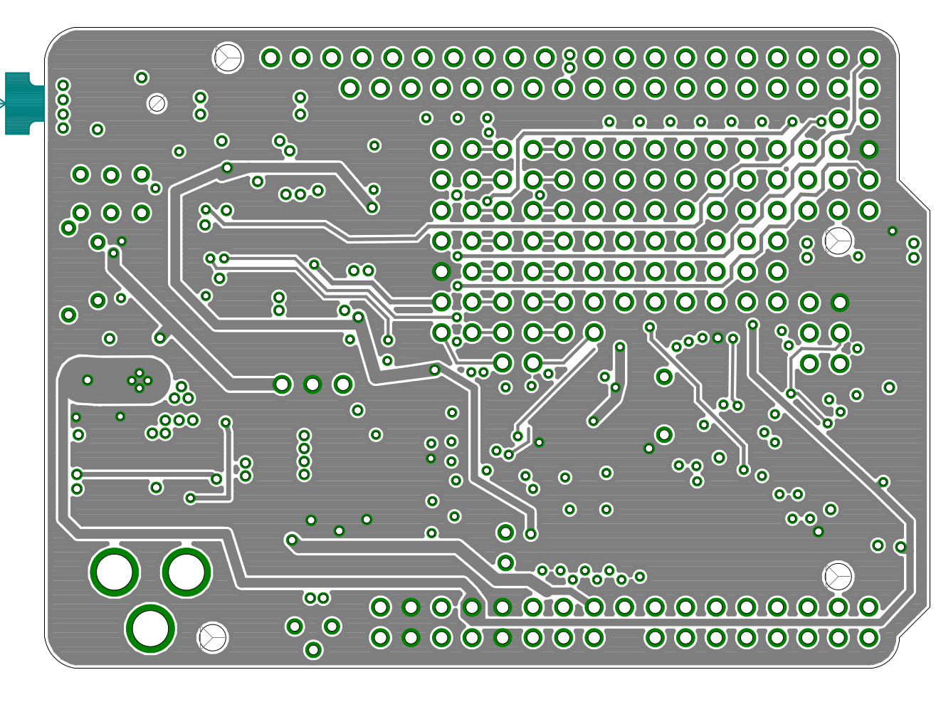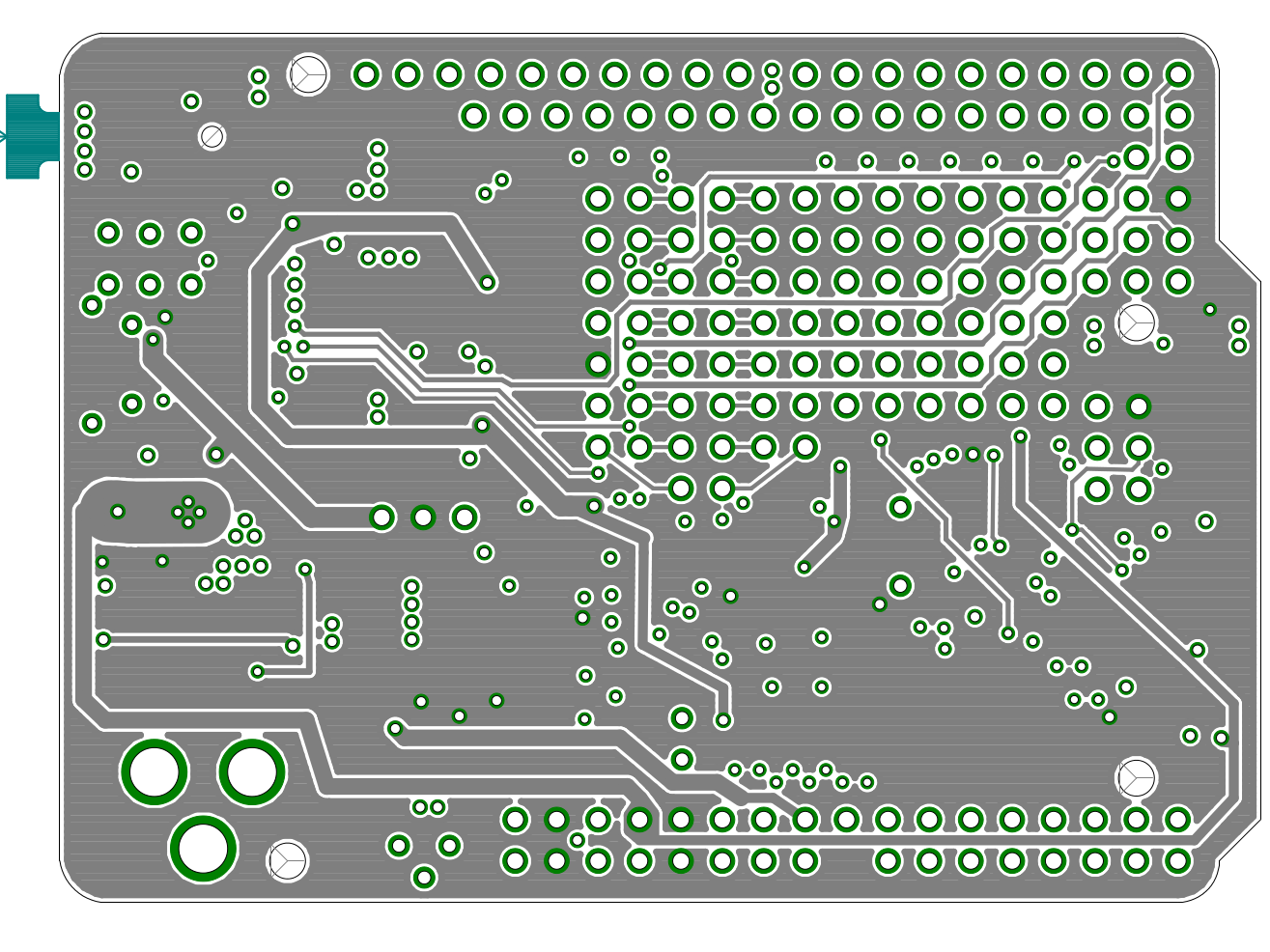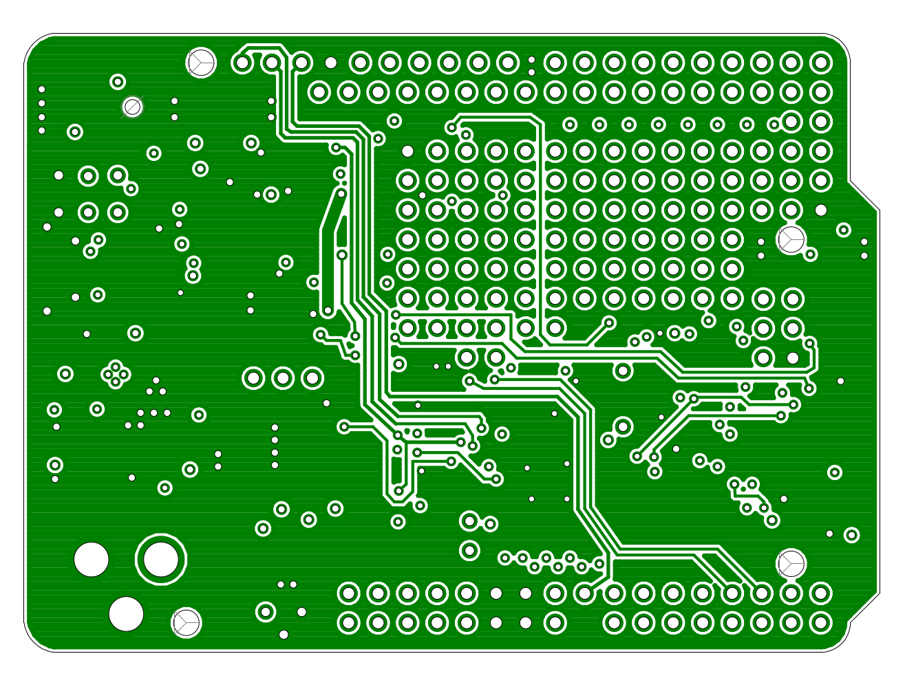 Obviously there was some feature creep over the course of experimentation, so I decided to add two SPI memory device layouts to the PCB. This would allow up to 23LC1024 256kByte of SRAM to be addressed, together with AT25M01 256kByte of EEPROM, for example. Putting these layouts on the board meant that the JTAG interface had to be moved to the back of the PCB. This was actually not a bad thing, as it would have been impossible to use the JTAG interface with a Shield in place anyway.