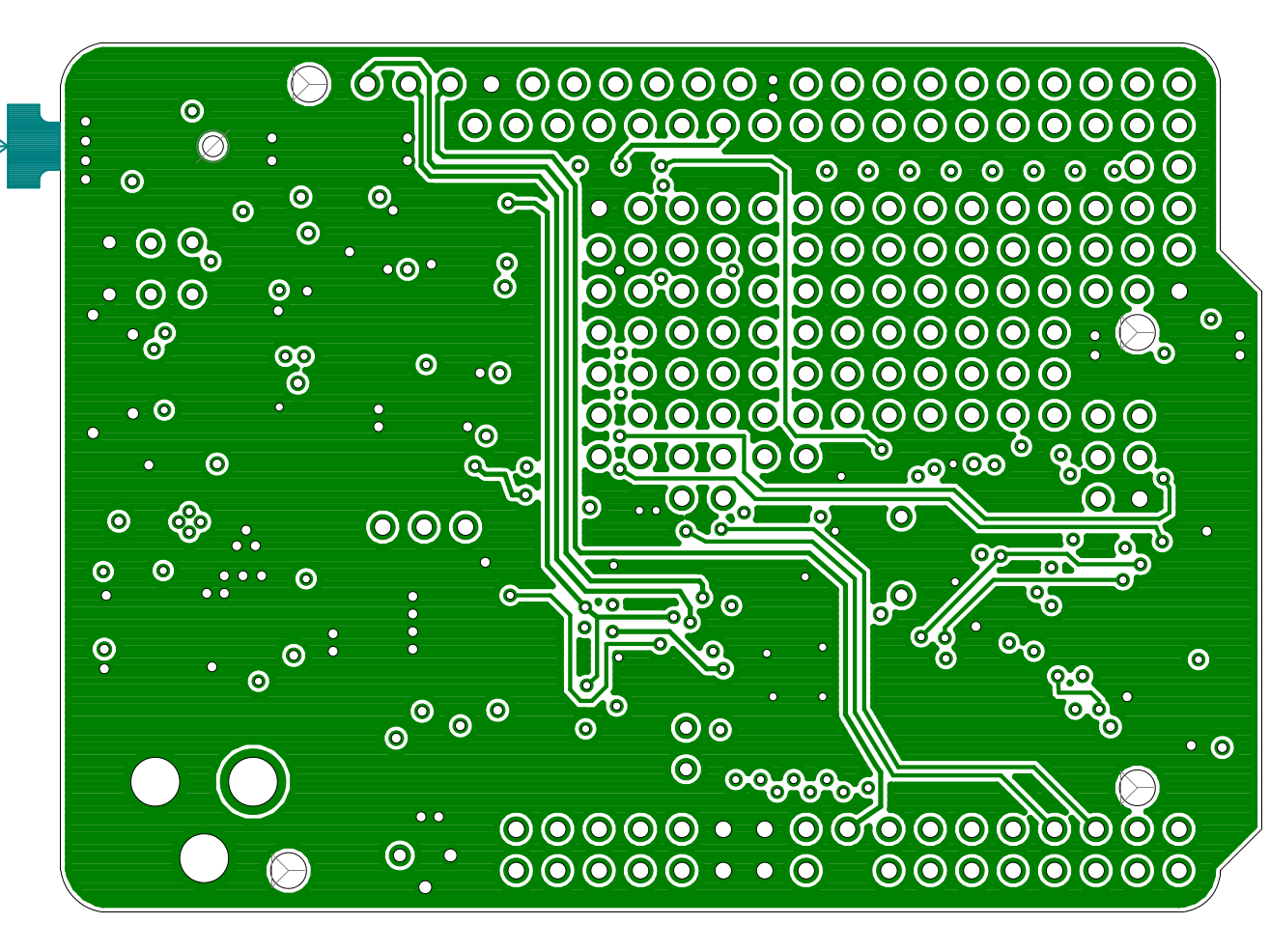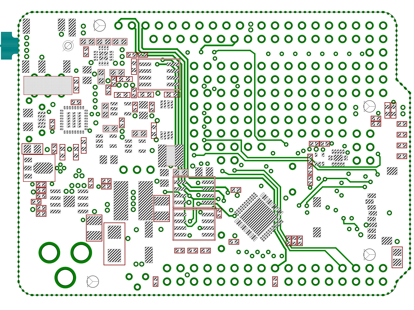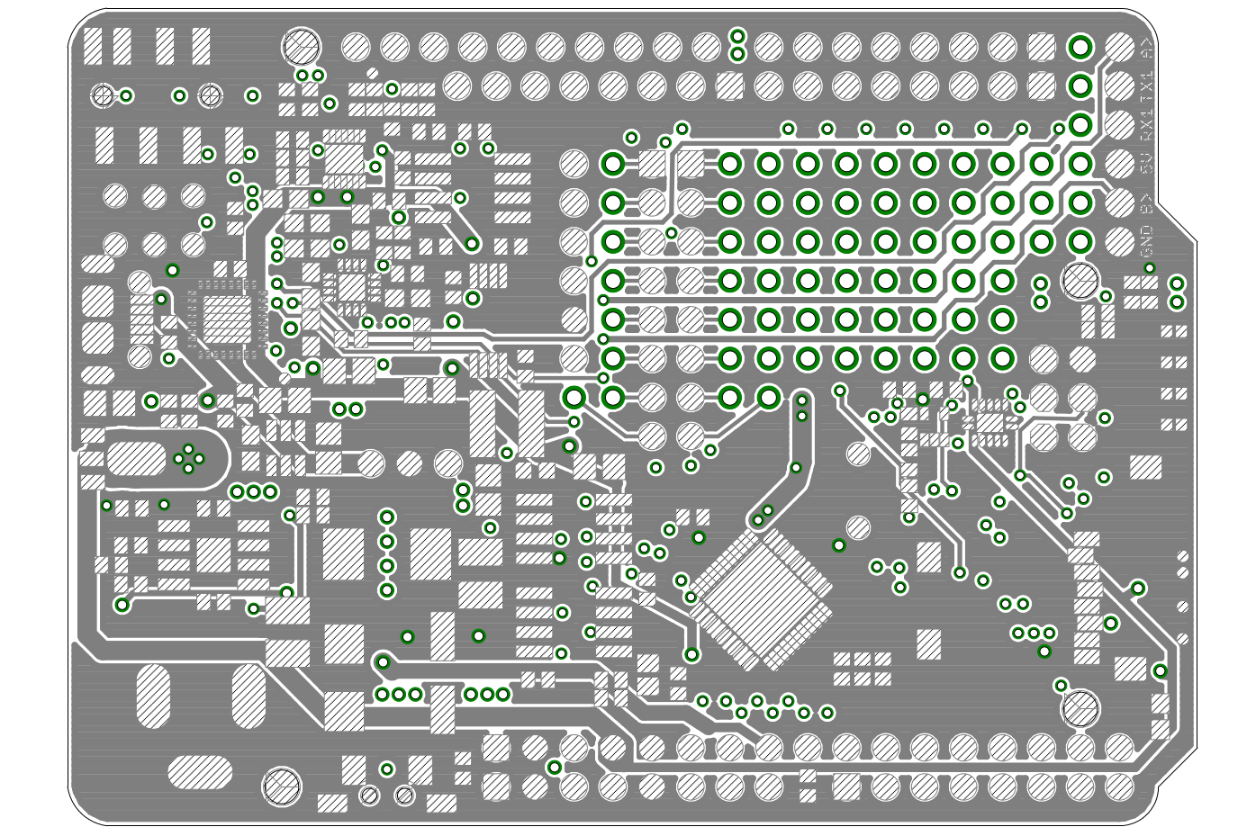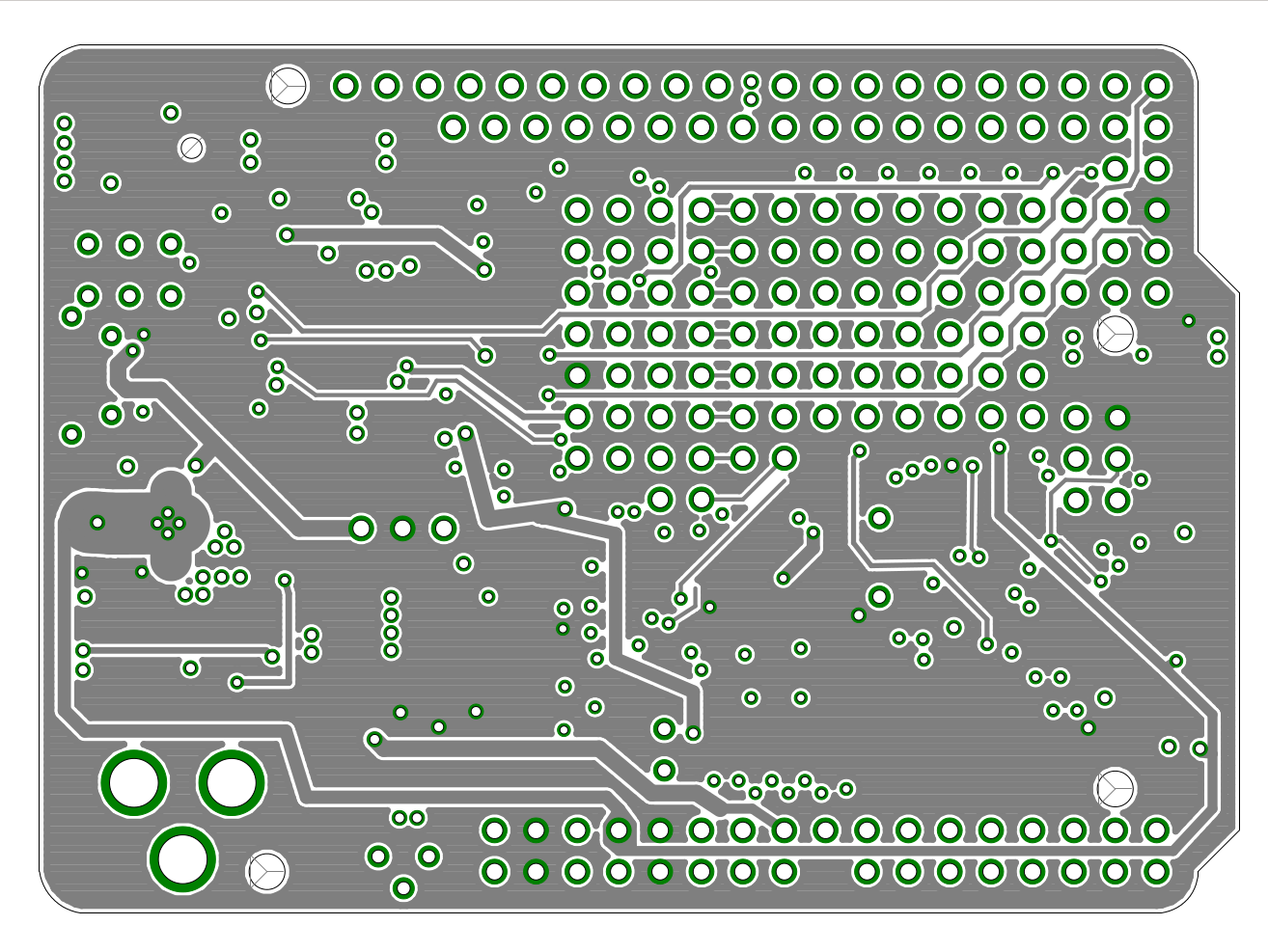 Obviously there was some feature creep over the course of experimentation, so I decided to add two SPI memory device layouts to the PCB. This would allow up to 23LC1024 256kByte of SRAM to be addressed, together with AT25M01 256kByte of EEPROM, for example. Putting these layouts on the board meant that the JTAG interface had to be moved to the back of the PCB. This was actually not a bad thing, as it would have been impossible to use the JTAG interface with a Shield in place anyway.