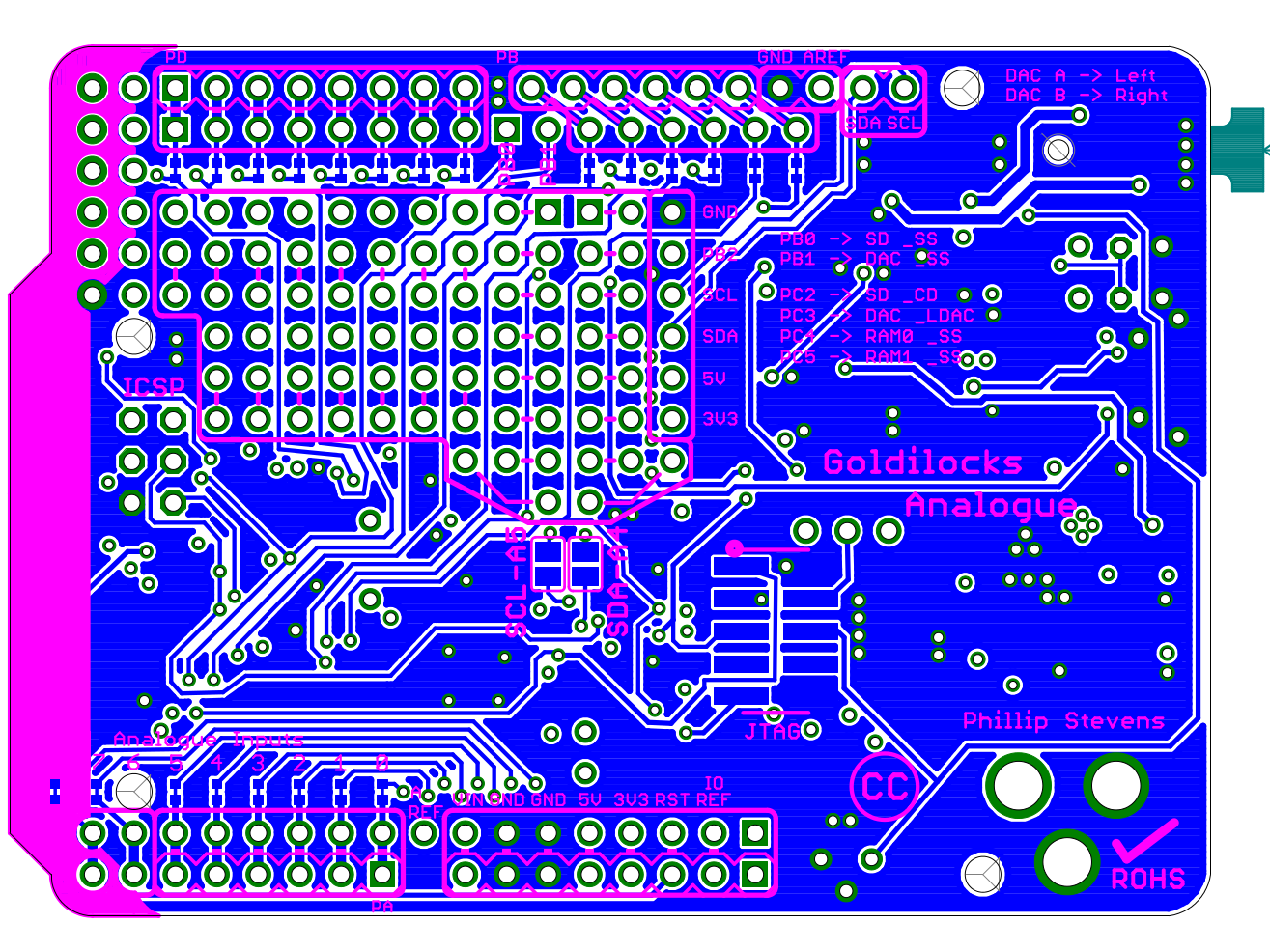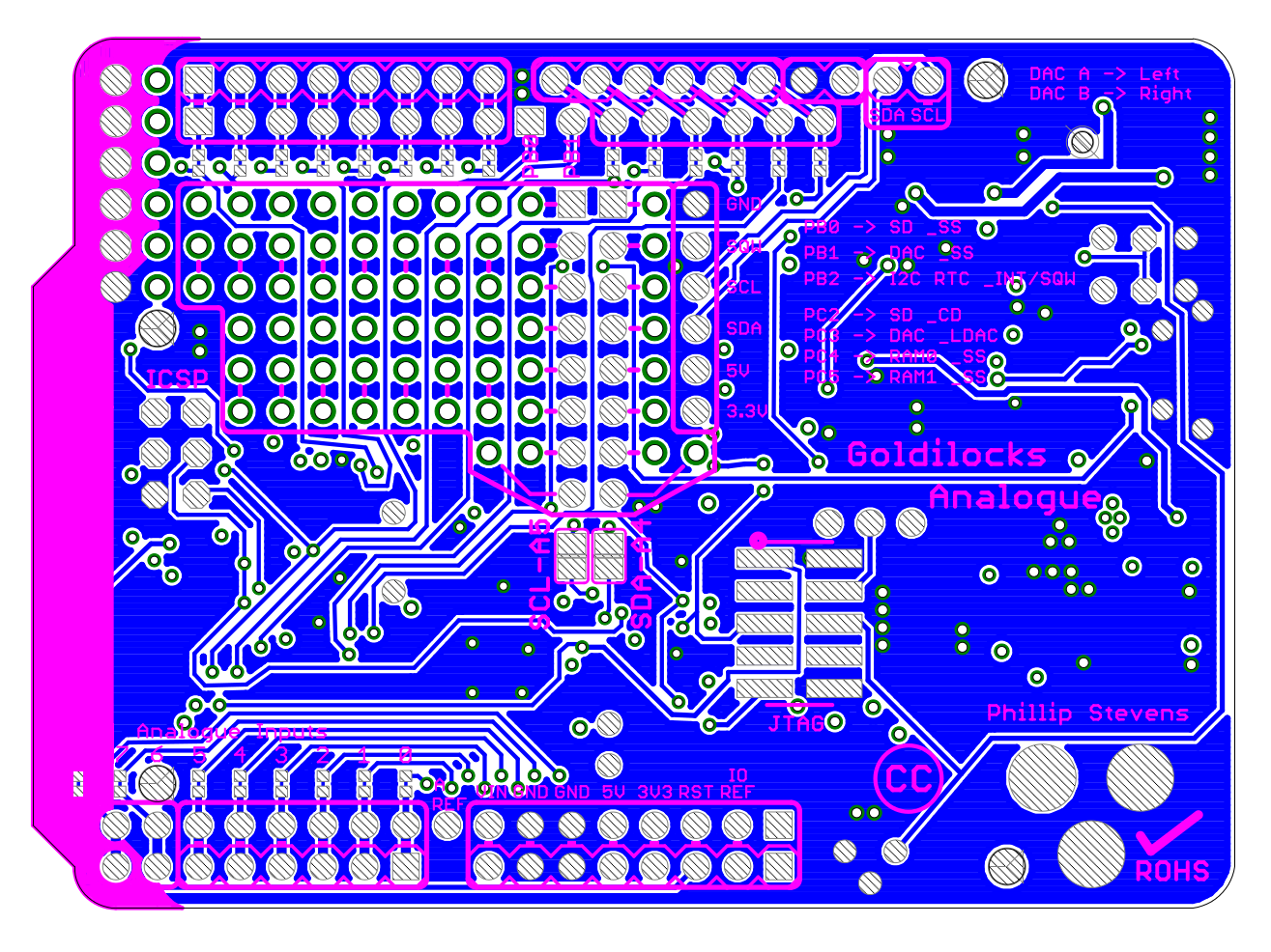 A major initiative of the Goldilocks is to bring an analogue capability to the Arduino platform via a DAC, so this project was called the Goldilocks Analogue. Following a Kickstarter campaign, the Goldilocks Analogue is now available on Tindie.