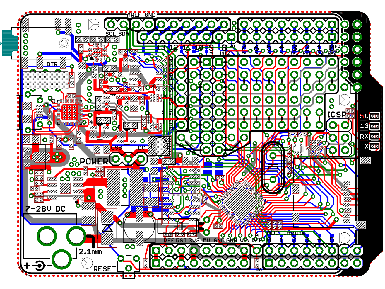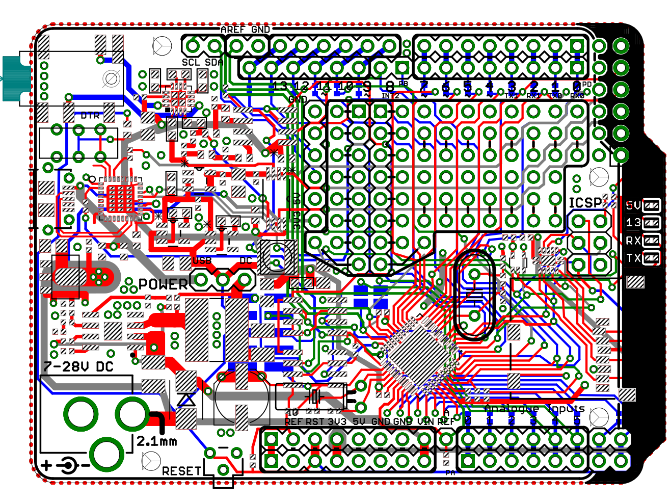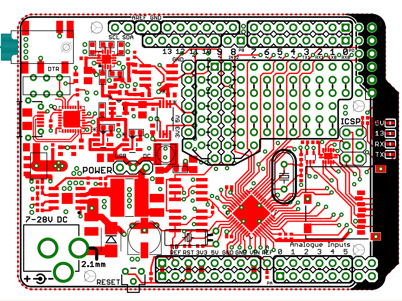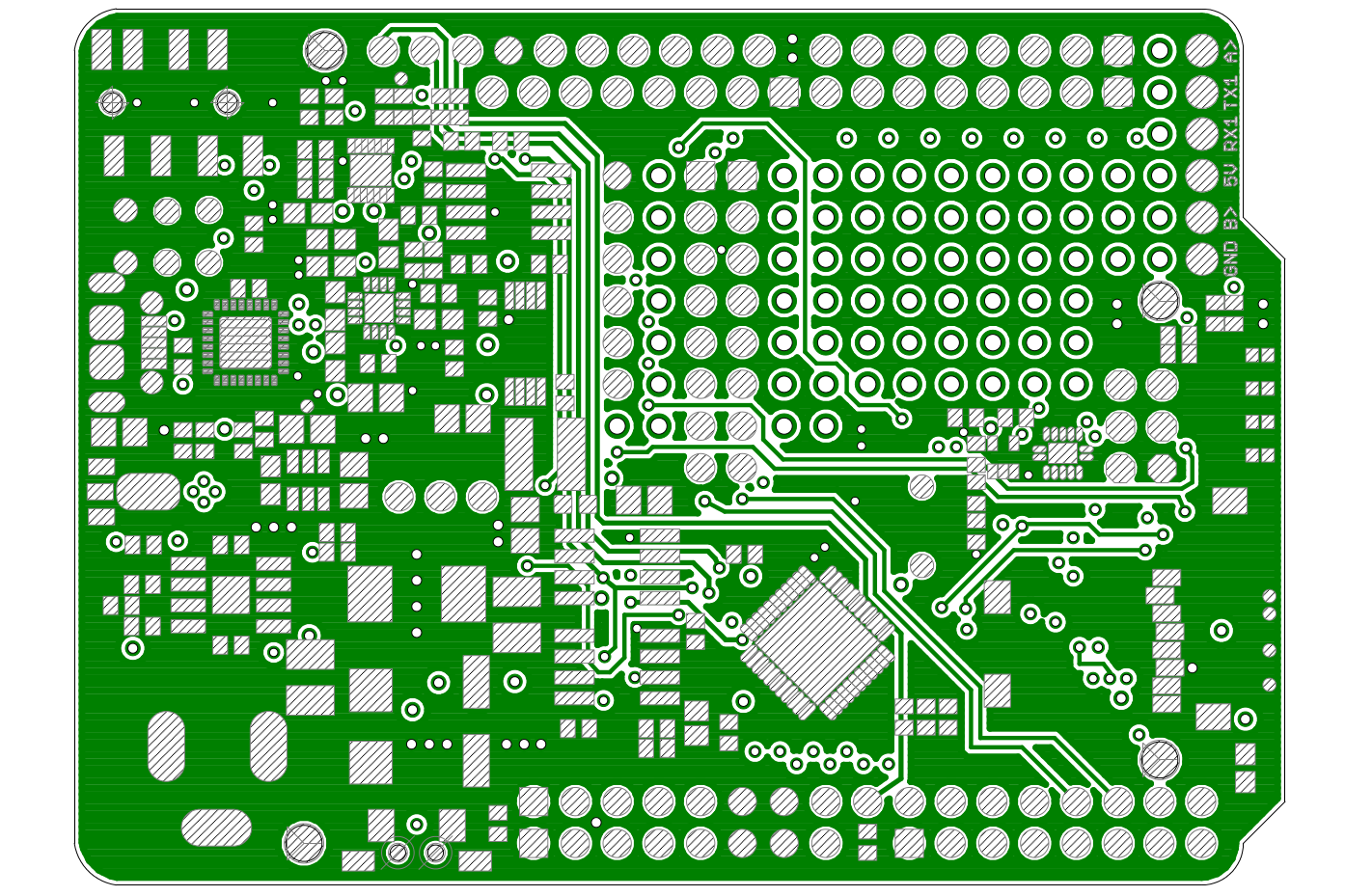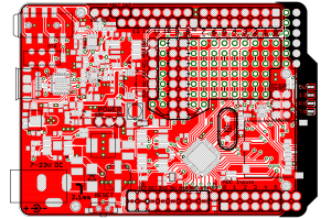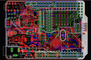 Version 1 also reverted the USB to Serial interface to use a proper FTDI FT232R device from the ATmega32u2 MCU (the solution preferred now by Arduino). Using the ATmega32u2 (or ATmega16u2) to interface with anything not running at its own 16MHz CPU clock rate is broken and doesn’t work. This is because the ATmega devices don’t produce correct serial when their CPU clock is not a clean multiple of the USART required rate. I learned this the hard way with the Goldilocks Project.