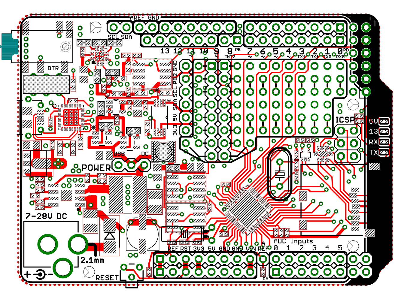 selection & DTR jumpers, other pin breakouts. For Freetronics boards