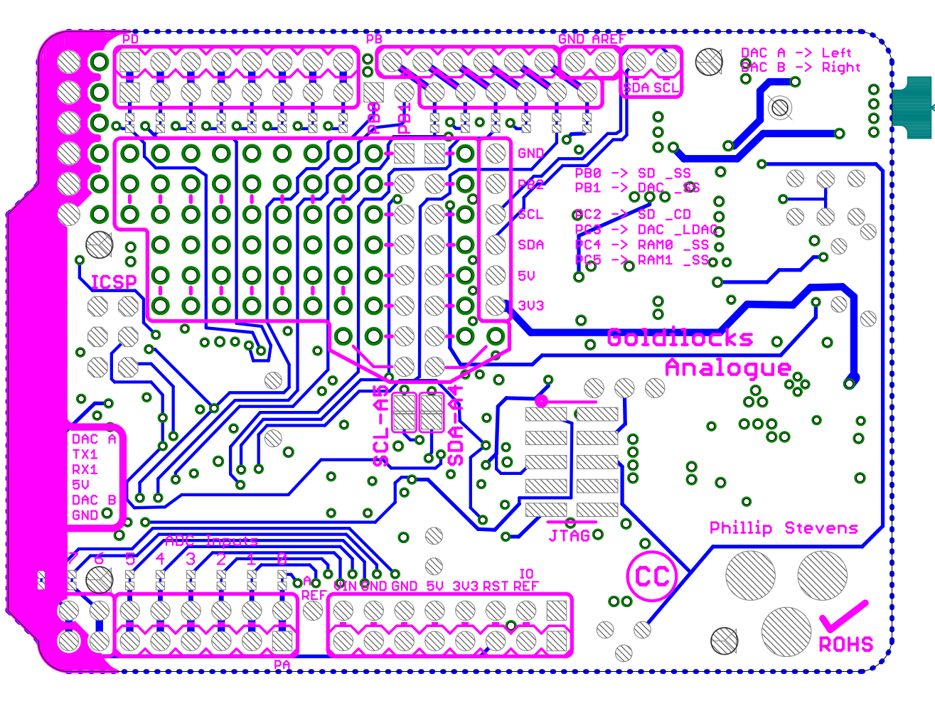 The Goldilocks project achieved that goal, but the resulting ATmega platform still lacked one function that I believe is necessary; a high quality analogue capability. The world is analogue, but having an ADC capability, without having a corresponding digital-to-analogue capability, is like having a real world recorder (the ADC capability) with no means to playback and recover these real world recordings.