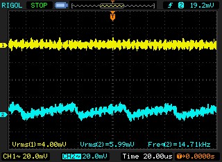 Channel 1 (yellow) is 4.0mV of noise present at the output capacitor for the power supply, and represents the lowest noise inherent in the supply. Channel 2 (blue) is the 5.6mV supply noise present on a test pin closest to the MCU.