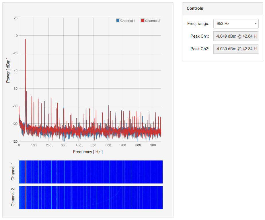 Looking at the spectra generated by both implementations up to 953Hz it is possible to see harmonics from the Sine Wave, and other low frequency noise.
