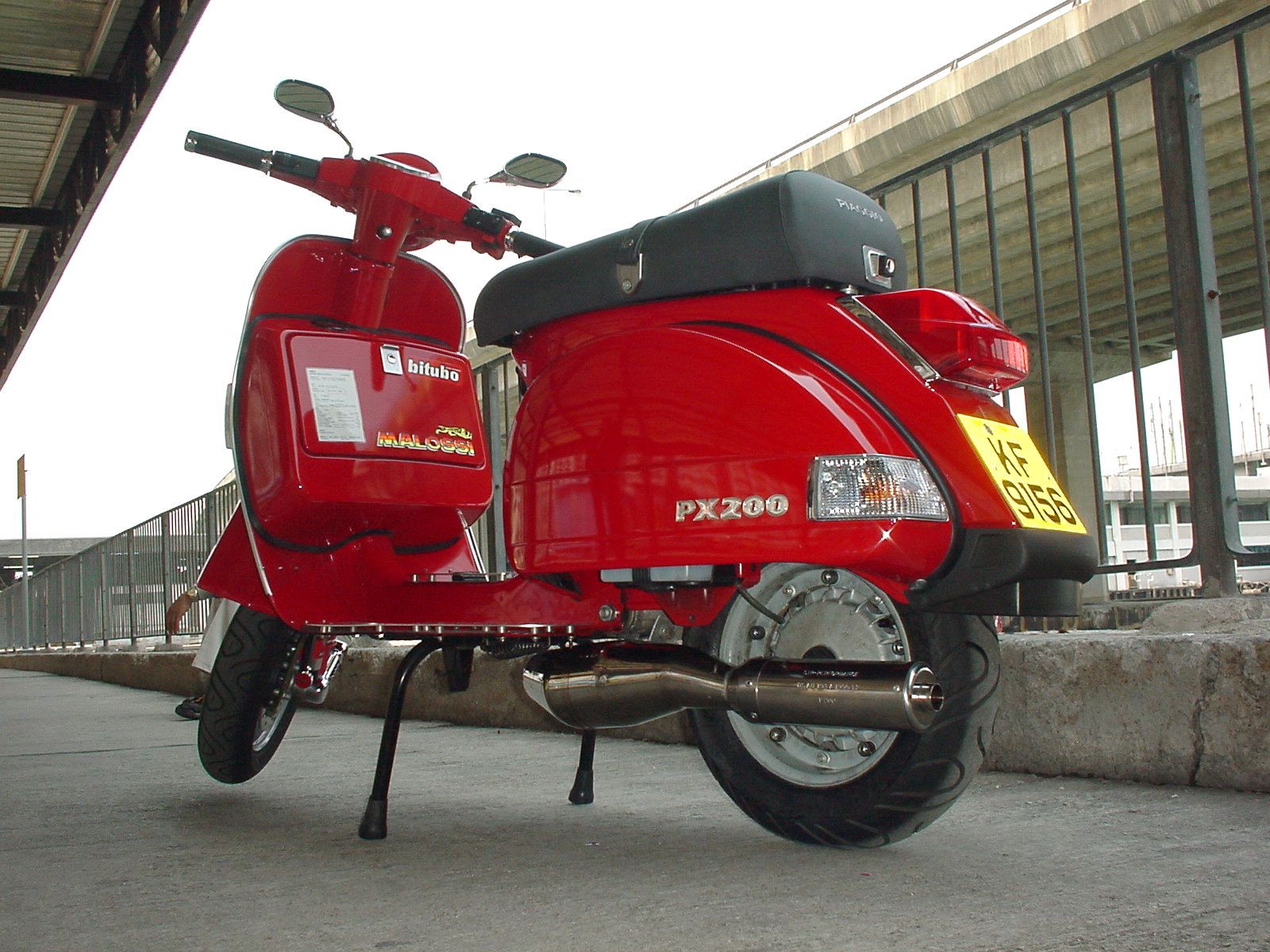 Horsepower is generated by a Malossi 210 cc cylinder and piston kit, with the transfer airways ground open and polished, together with a SIP cylinder head and Mazzucchelli PX200 racing crankshaft. The exhaust is fed into a SIP stainless steel polished cross-over pulse tuned exhaust. Using the cross-over exhaust means that a spare tire will no longer fit, so a can of puncture repair lives in the glove box.