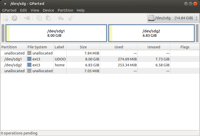 The elinux wiki has instructions for creating a bootable uSD card for UDOO. These are easy to follow, so I’ll not repeat all the details here. Using GParted I only left 8 MByte space before the start of the primary partition, and I labelled it “UDOO”. I also split the card in half, creating a secondary partition for the /home partition. This may take some time to complete, if your uSD is slow…