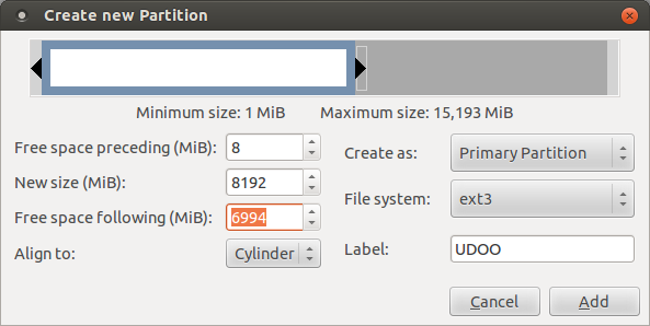 Now prepare the SSD, by formatting it in the same way you formatted the uSD previously. I’m now adding an additional linux-swap partition about 2GB in size. Although there are warnings about using SSD for swap, if you’re using a full desktop on your UDOO, your browser won’t respect the memory limitation and you’ll create worse problems.