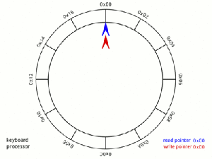 But firstly, how does the ring buffer work? For the details, the Wikipedia entry on circular buffers is the best bet. But quickly, the information (usually a byte, but not necessarily) is pushed into the buffer by the producer, and it is removed by the consumer.